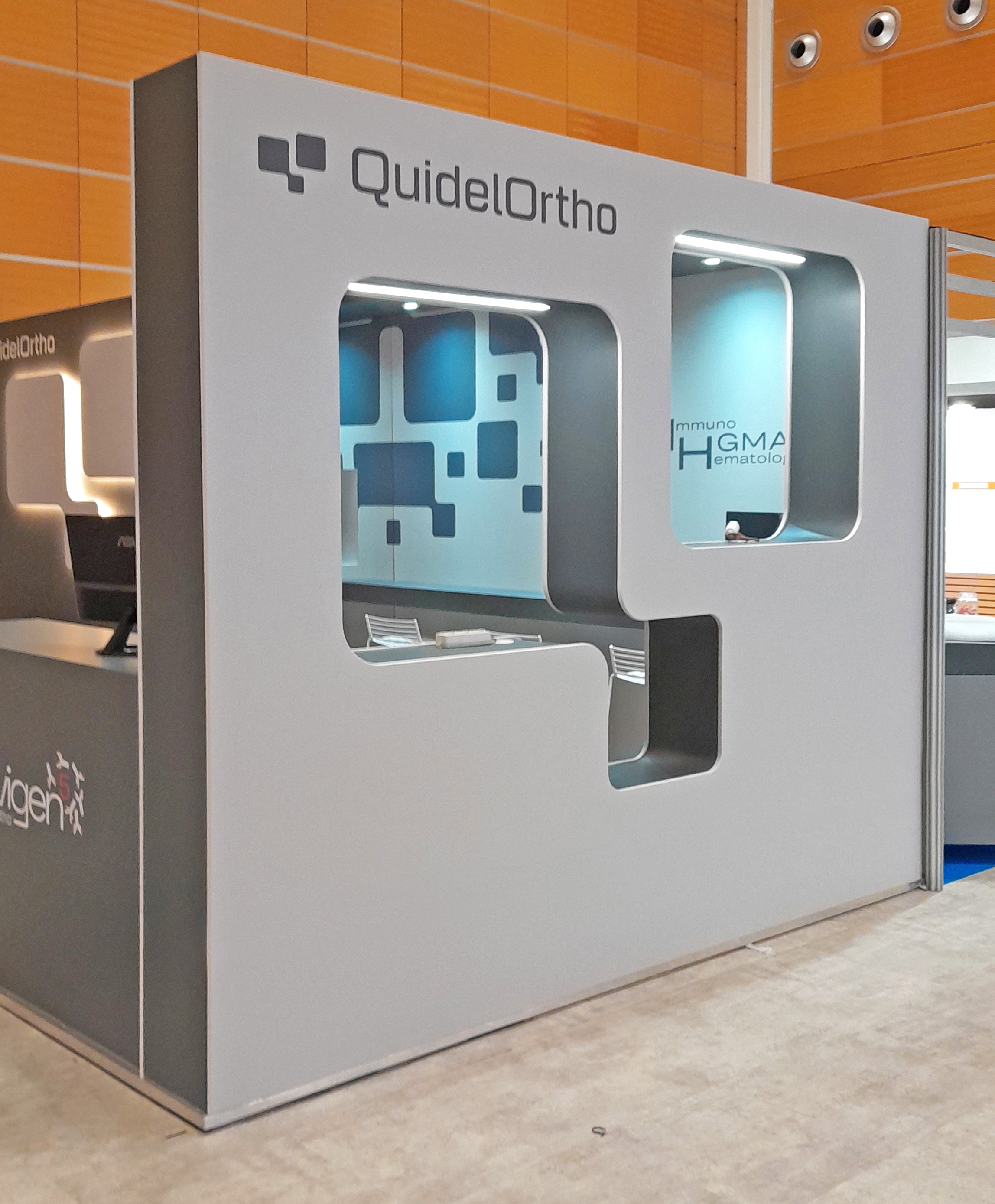 Quidel Ortho 120sqm stand at the Eurolab Congress in Rome, with custom finishes